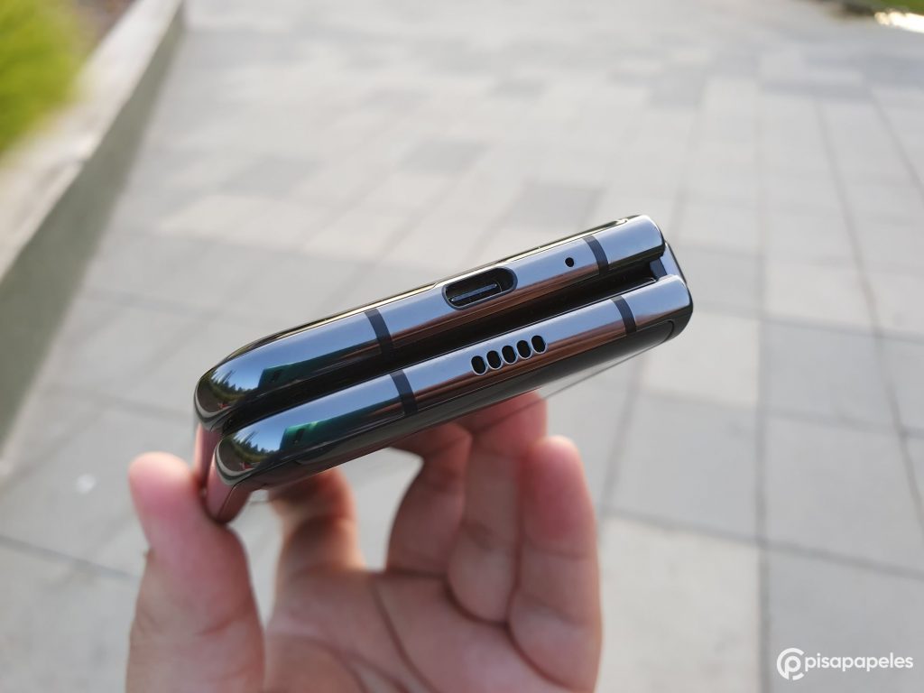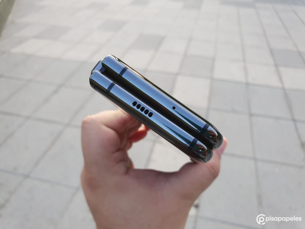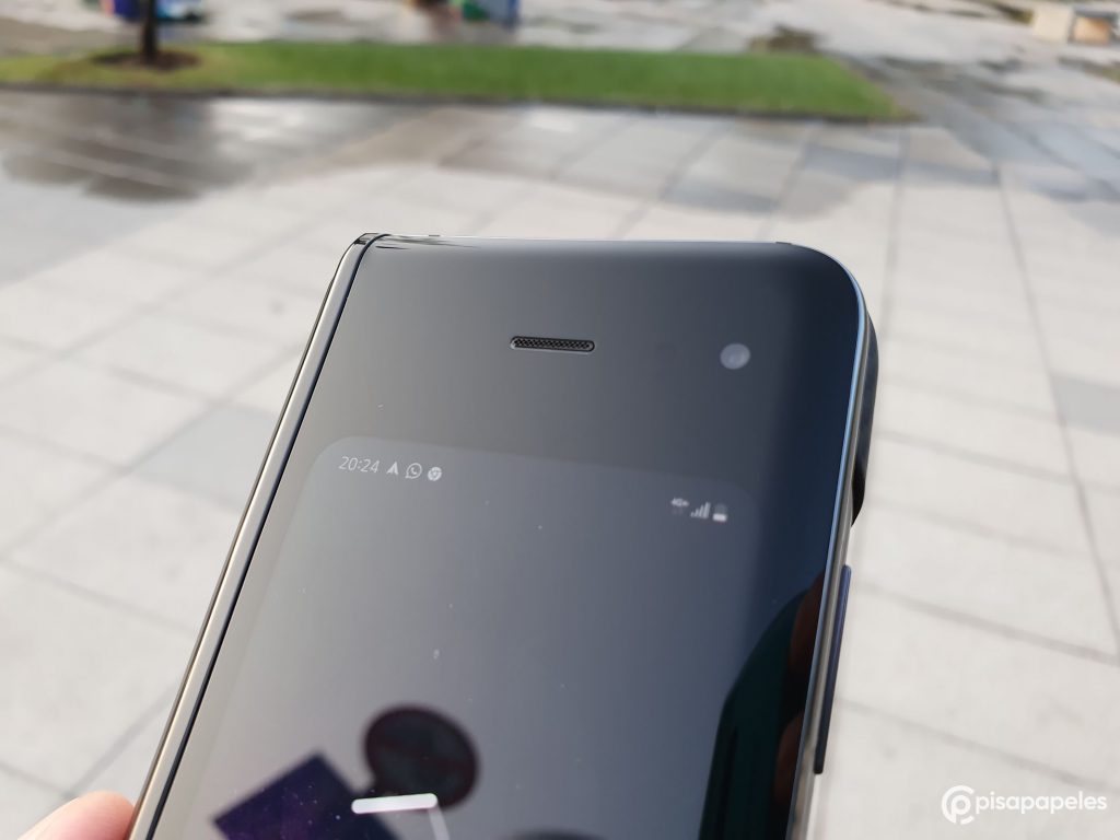 El equipo también cuenta con su propio auricular dedicado 100% para las llamadas ubicado en la parte frontal del equipo (cuando está cerrado). Eso sí, cuando el equipo está desplegado y recibes una llamada, el Galaxy Fold te muestra un mensaje que te dice que puedes contestar cerrando el dispositivo o activando el altavoz, pero NO puedes hablar con la pantalla abierta y acercándotelo al oído.