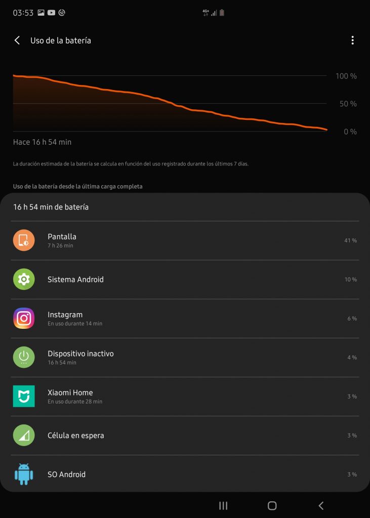 Duración total desde la primera carga completa: 16 horas, y 54 minutos.