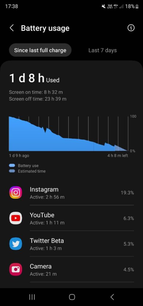 Dependiendo del uso que le demos, podemos fácilmente alcanzar entre un día a un día y medio de uso sin problemas. Todo esto, utilizando las configuraciones por defecto del equipo: pantalla en resolución Full HD+, tasa de refresco a 120 Hz y Always-On Display activado. De igual forma, utilizando una mezcla entre WiFi y datos móviles (lamentablemente solamente en 4G y/o 4G+, porque me encuentro probando el equipo fuera de Santiago).