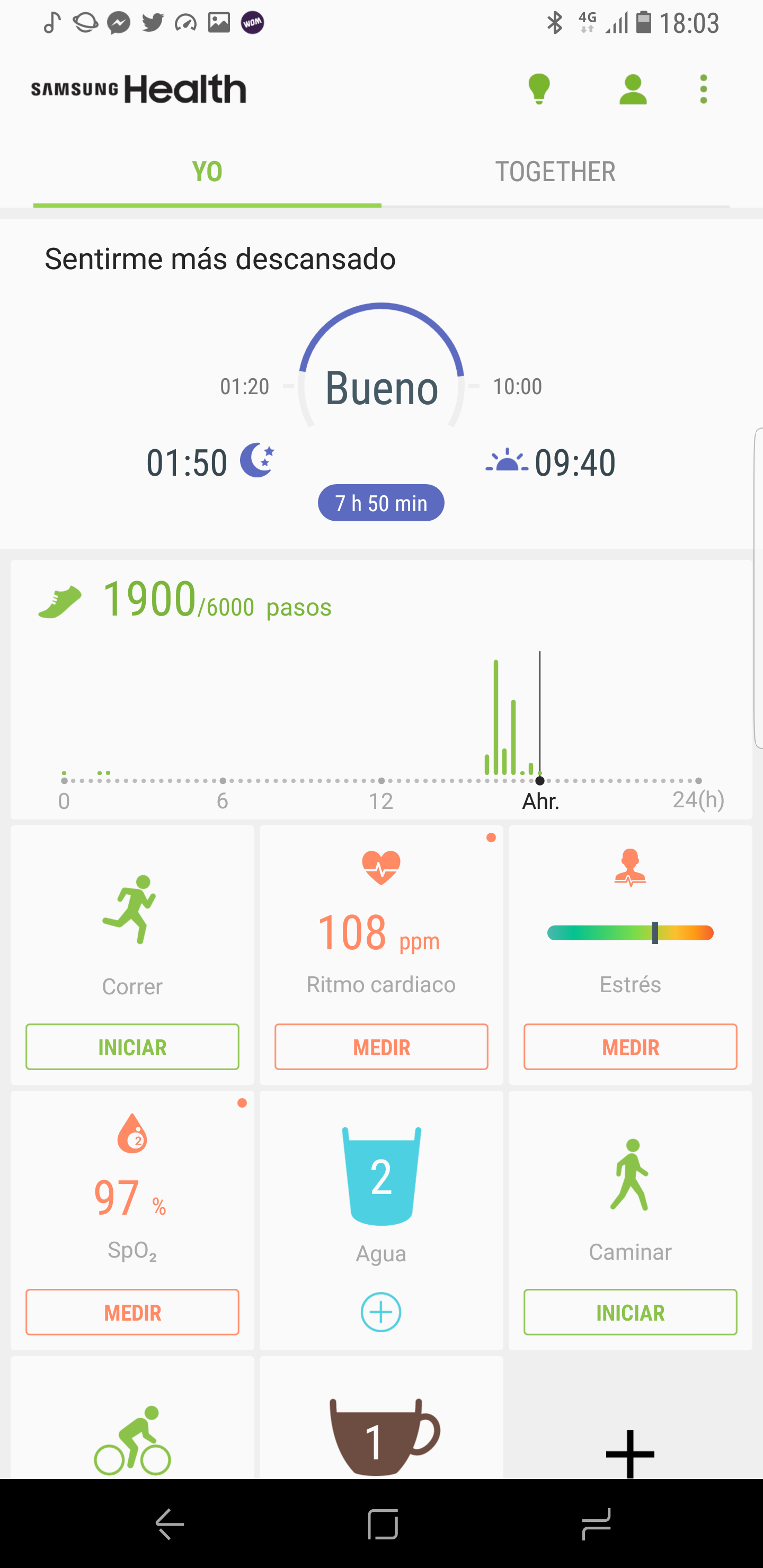 Aplicaciones usadas: Twitter, Facebook, Messenger, Google Chrome, Google Now, Spotify, Samsung Music, Gmail, YouTube, Sismo Detector, Samsung Health, Android Wear, Bixby, Instagram, WhatsApp y Telegram.