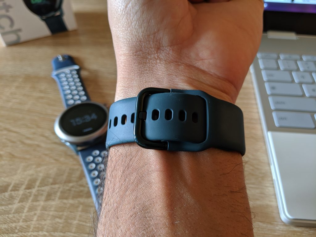 Por último, la correa con la que vienen los Galaxy Watch Active es de 20mm, lo que implica compatibilidad con cualquier correa de este tamaño, y está fabricada en silicona. Si bien la correa cuenta con un método clásico de ajuste, para esconder lo que sobra de correa utiliza uno popularizado por Apple en sus correas deportivas, ya que existe un agujero para meter lo que sobra bajo el resto de la correa.