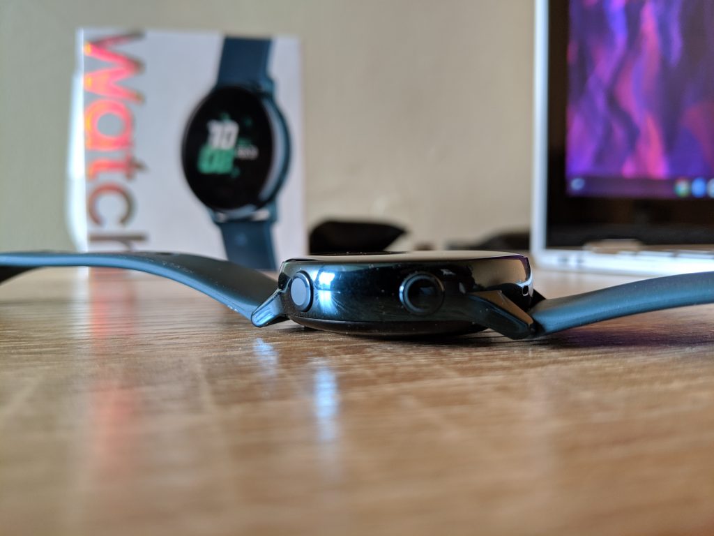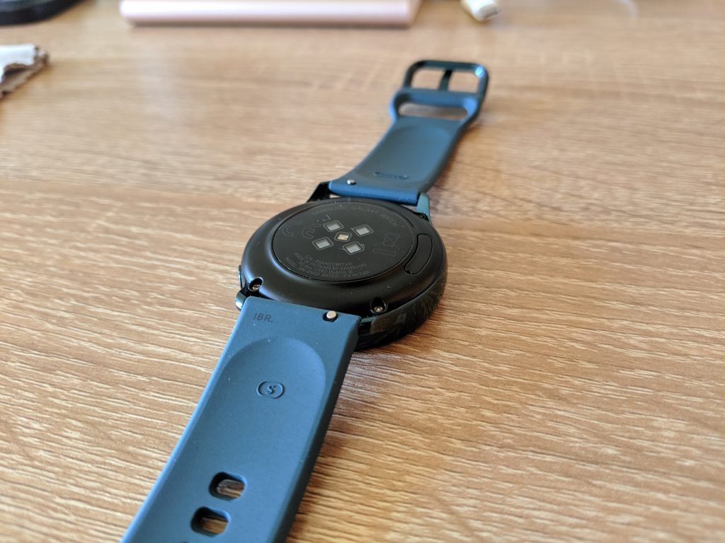 Volviendo al diseño, el Galaxy Watch Active presenta un cuerpo bastante pequeño, de 39.5mm en el circulo y 10.5mm de grosor, con un peso de 25 gramos, que lo hacen los suficientemente cómodo como para incluso dormir con él. Los bordes del reloj están construidos en aluminio, mientras que en la parte de atrás, donde su ubica el sensor de ritmo cardíaco, es de plástico y vidrio. La verdad es que se ve muy bonito y premium.