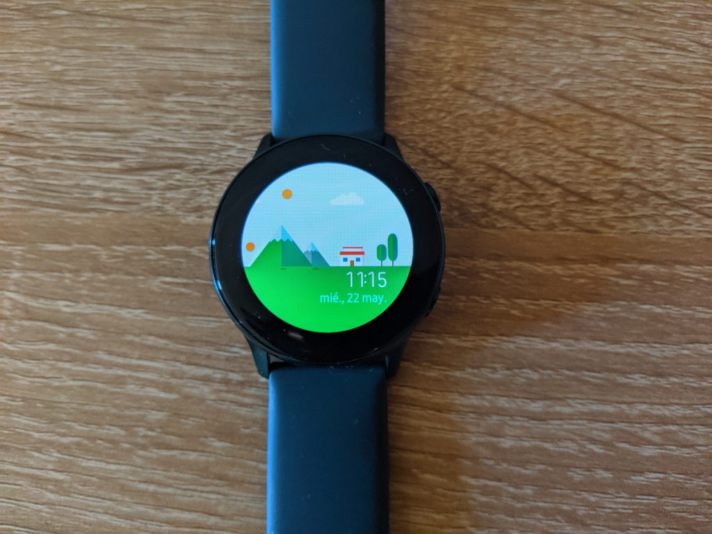 Sin duda que lo primero que nos llama la atención a nivel de diseño del Galaxy Watch Active es la ausencia de su bisel rotatorio, que nos permitía movernos por la interfaz de Tizen en los relojes de Samsung. En vez de dicho bisel, la empresa surcoreana ha puesto nada más y nada menos que un gran marco negro que no hace nada más que darle un diseño más sobrio y deportivo al Active en su frontal, pero que en verdad no se ve para nada bien con la pantalla encendida cuando hay colores en ella. Es muy grande.