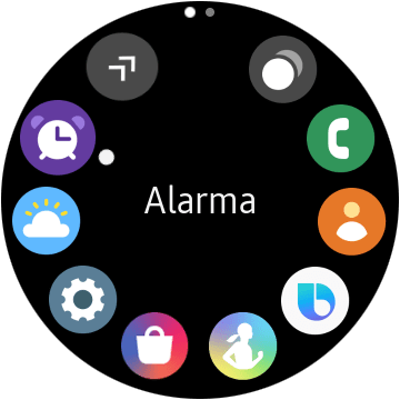 Si presionamos el botón inferior derecho podremos encontrar las aplicaciones instaladas en el reloj, las cuales se muestran en un formato circular y sin un nombre que las identifique, por lo que debemos guiarnos por los iconos para acceder a ellas. Si hacemos una doble pulsación en el mismo botón, accederemos a Bixby, el cual aún no funciona en español, pero al probarlo en inglés ha cumplido con iniciar un entrenamiento o informarme el clima.