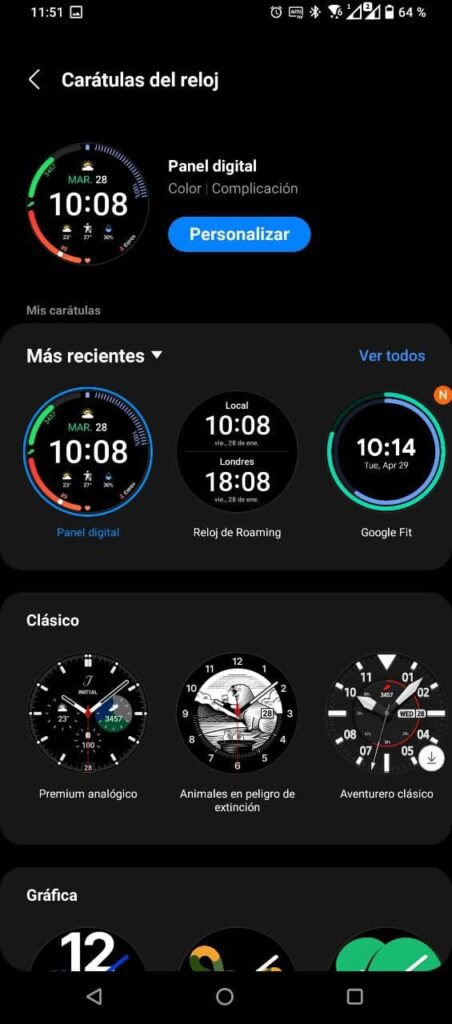 Para configurar el reloj, debemos descargar en nuestro teléfono desde la Google Play Store la aplicación Galaxy Wearable. Y una vez configurada, esta nos ofrece muchas opciones para controlar las funciones del reloj como las carátulas o esferas, ajustes varios como el brillo, volumen y sonidos, configurar los widgets, ajustes de aplicación y más.