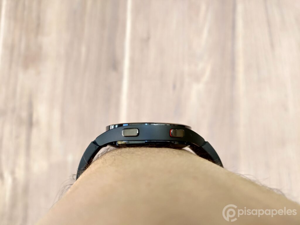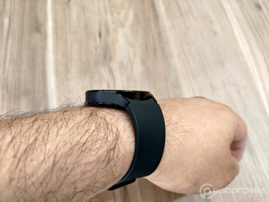 Aunque el dispositivo no posee una corona, sí cuenta con un bisel táctil giratorio que cumple la misma función. Sólo basta con deslizar el dedo en el contorno de la pantalla (a la derecha o izquierda) para empezar a movernos por la interfaz. También sentiremos leves vibraciones hápticas que nos van guiando al momento de desplazarnos.