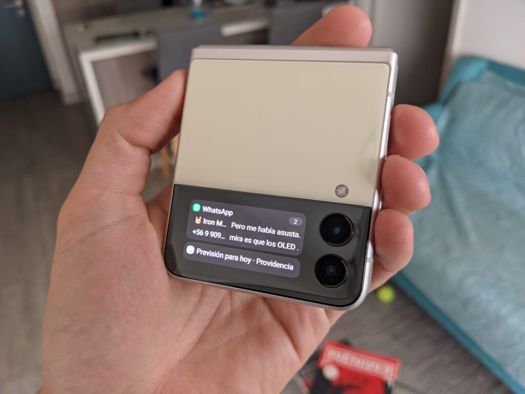 Para mi, la mejora más notable del Z Flip 3 es su pantalla externa, la cual es mucho más útil debido a que básicamente es más grande. Esta pantalla es de 1.9 pulgadas y cuenta con tecnología Super AMOLED, con una resolución de 260 x 512 píxeles, alcanzando un brillo máximo de 935 nits y el cual lamentablemente siempre debe ser controlado de forma manual ya que no hay un sensor de luminosidad en la parte externa. Tampoco es que lo vayamos a estar regulando mucho, pero me ha pasado que en la noche es muy brillante y al disminuirlo, al día siguiente no la veo del todo bien a plena luz del sol.