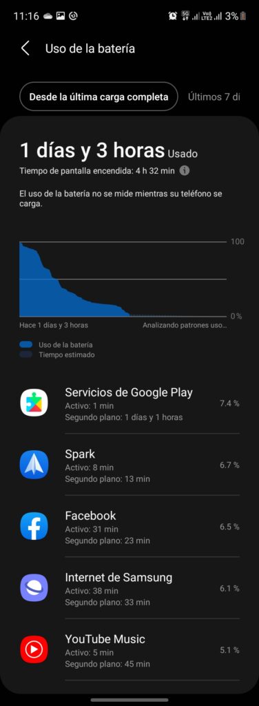Ahora, con el uso personal que le di al Z Fold 3 me entregó una autonomía de 1 día con 3 horas en total, mientras que su pantalla estuvo encendida durante 4 horas con 32 minutos. Tenía el brillo automático, usé ambas pantallas, conectividad 5G activa y Dual SIM activados.