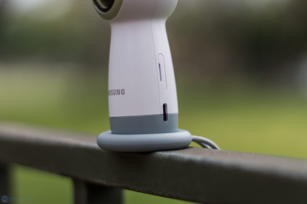 La Gear 360 2017 no cuenta con mucho que destacar en su exterior; en el inferior nos encontramos con la rosca para poder montarlo a un trípode, mientras que por los lados tenemos ambos sensores, un botón para grabar o tomar fotos, el de encendido y apagado, un botón para poder establecer la conexión con el teléfono, la pantalla de estado, el conector para USB-C, el slot para tarjetas micro-SD un pequeño parlante y unas cuantas luces de notificación.