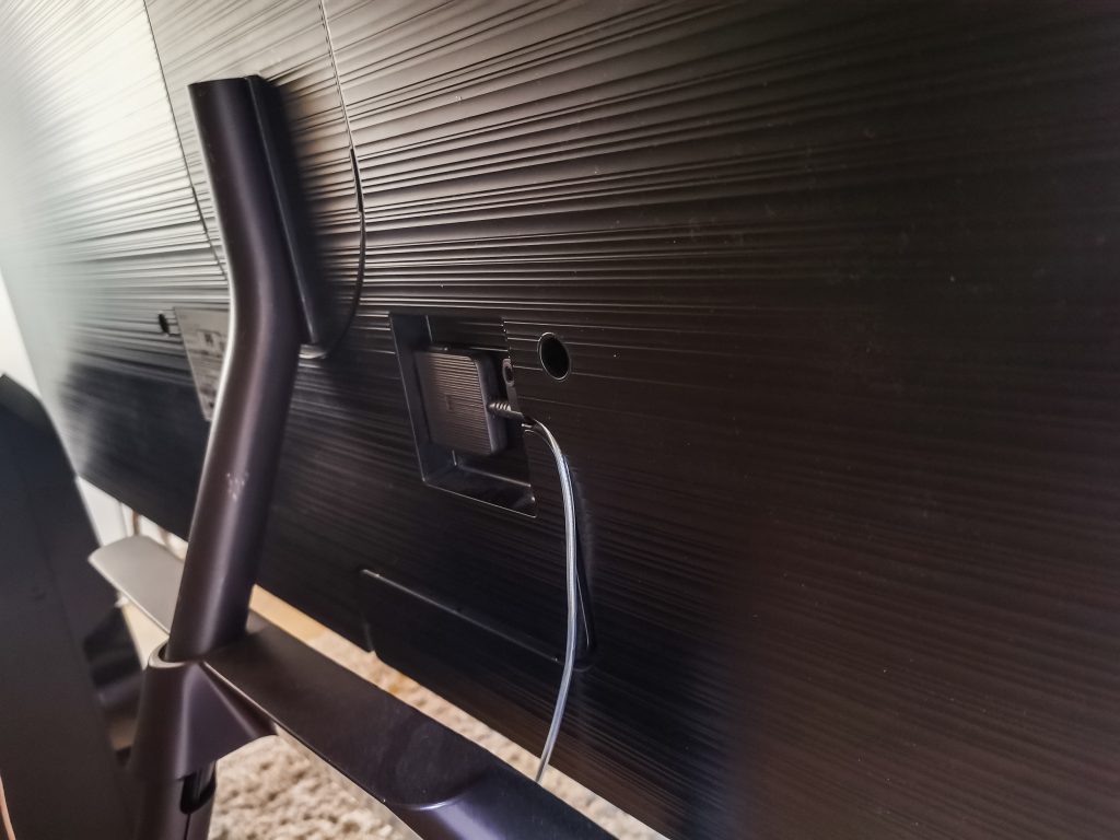 El cable que une el The Frame con esta caja es de fibra de vidrio — por lo que es bastante frágil —, y tiene un largo suficiente como para tener el One Connect Box alejado del televisor, en caso de que queramos colgarlo en alguna parte en donde no tengamos un mueble cerca. Si tu muralla es de un tono claro, no deberías tener problemas como para esconder el cable.