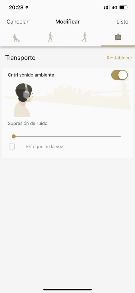 En el caso de que vayas en un medio de transporte, lo ideal será bloquear todo de tipo de ruido, por lo que el sistema eliminará totalmente el ruido ambiente (y de verdad lo hace muy bien), incluyendo las voces y se centrará solo en que escuches tu música.