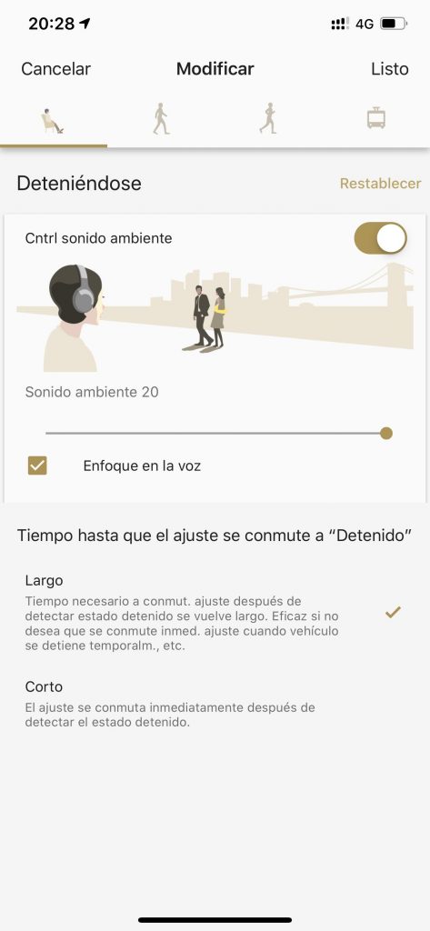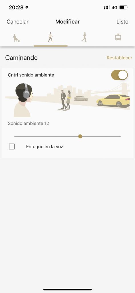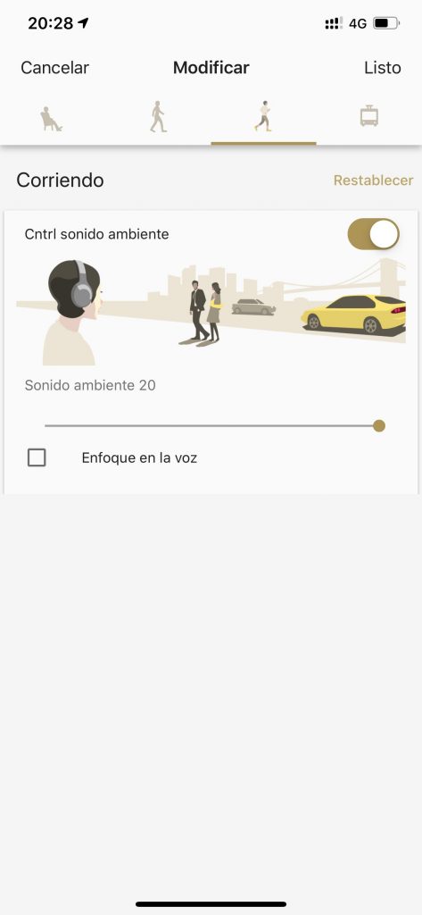 De esta manera irá configurando el nivel de ruido ambiente que deja entrar de acuerdo a lo que estás haciendo. En el caso de que estés detenido, el sistema cancelará el ruido ambiente, pero dejará que las voces puedas lograr escucharlas.