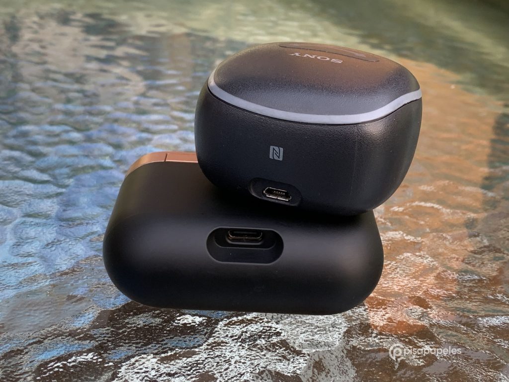 Por la parte frontal de la funda nos encontraremos con un LED de color rojo que nos avisará cuando está cargando los audífonos, por lo que no tenemos la necesidad de abrir la tapa como sucedía con los WF-SP700N, además acá contamos con un puerto USB Tipo-C para la carga.