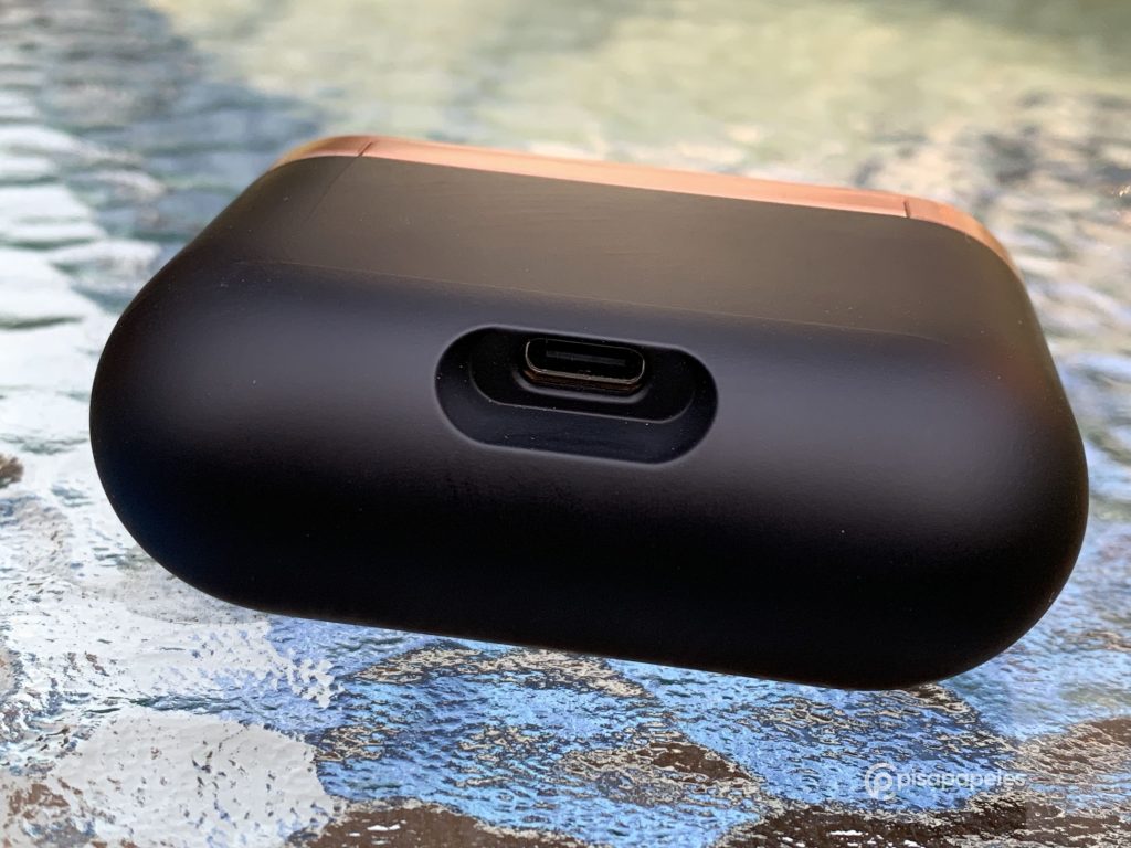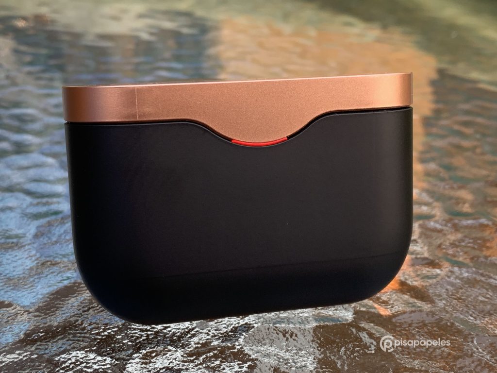 Cuando los sacamos del empaque por primera vez, nos vamos a encontrar con la funda de carga, la cual tiene un diseño muy moderno y elegante, mezclando el color negro con el color bronce que lo hacen relucir.