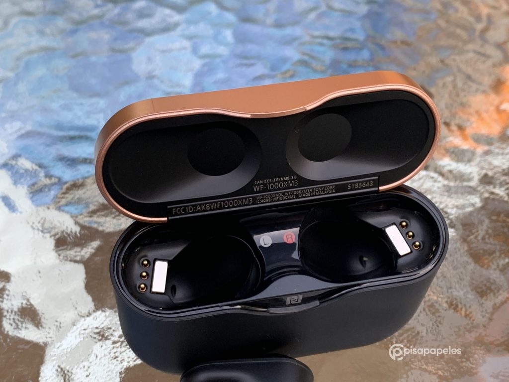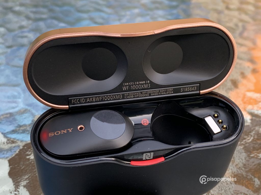 Cuando retiramos uno de los audífonos, veremos el espacio destinado para ellos, además del imán que los deja firmes en su espacio y los tres pines de contacto para la carga de la batería. Justo en el LED rojo de la funda, está el logo de NFC para poder sincronizar los audífonos de manera rápida con dispositivos Android compatibles.