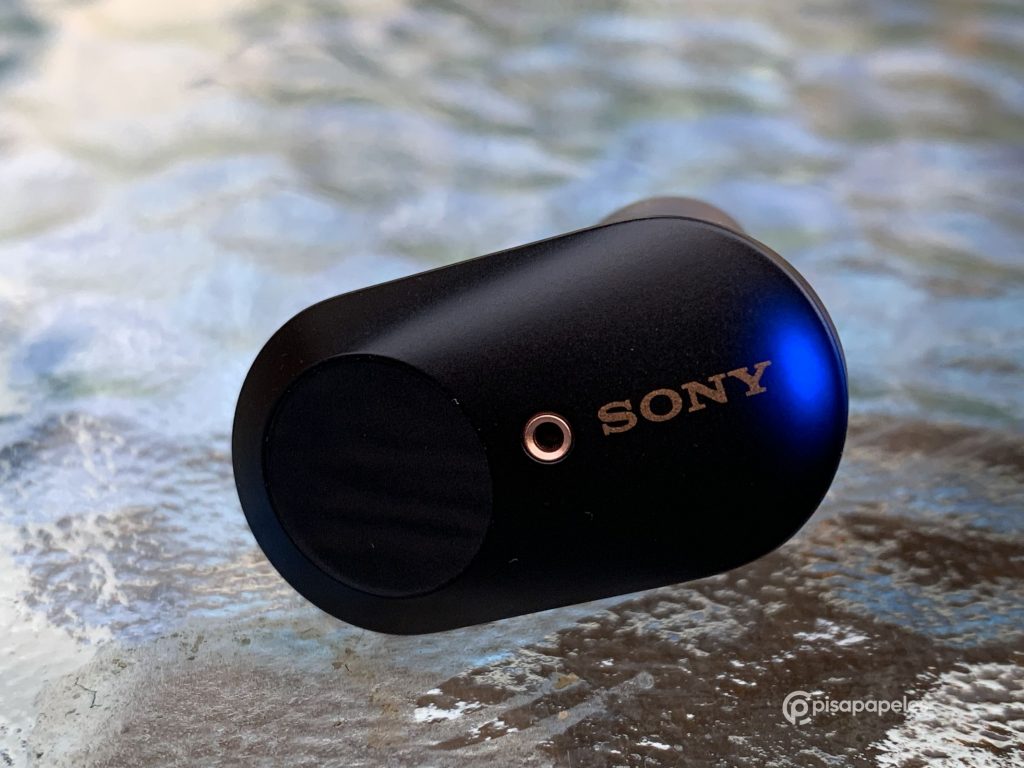 Si pasamos a revisar los audífonos, por su parte superior nos encontraremos con un panel táctil que nos brindará acceso a variadas funciones que te detallaré después. Por ese mismo lado veremos uno de sus micrófonos rodeado de un círculo de color bronce que le da su toque de elegancia, acompañado del logo de Sony y un LED de color azul que indica que está encendido y que cambia a rojo cuando se está cargando.