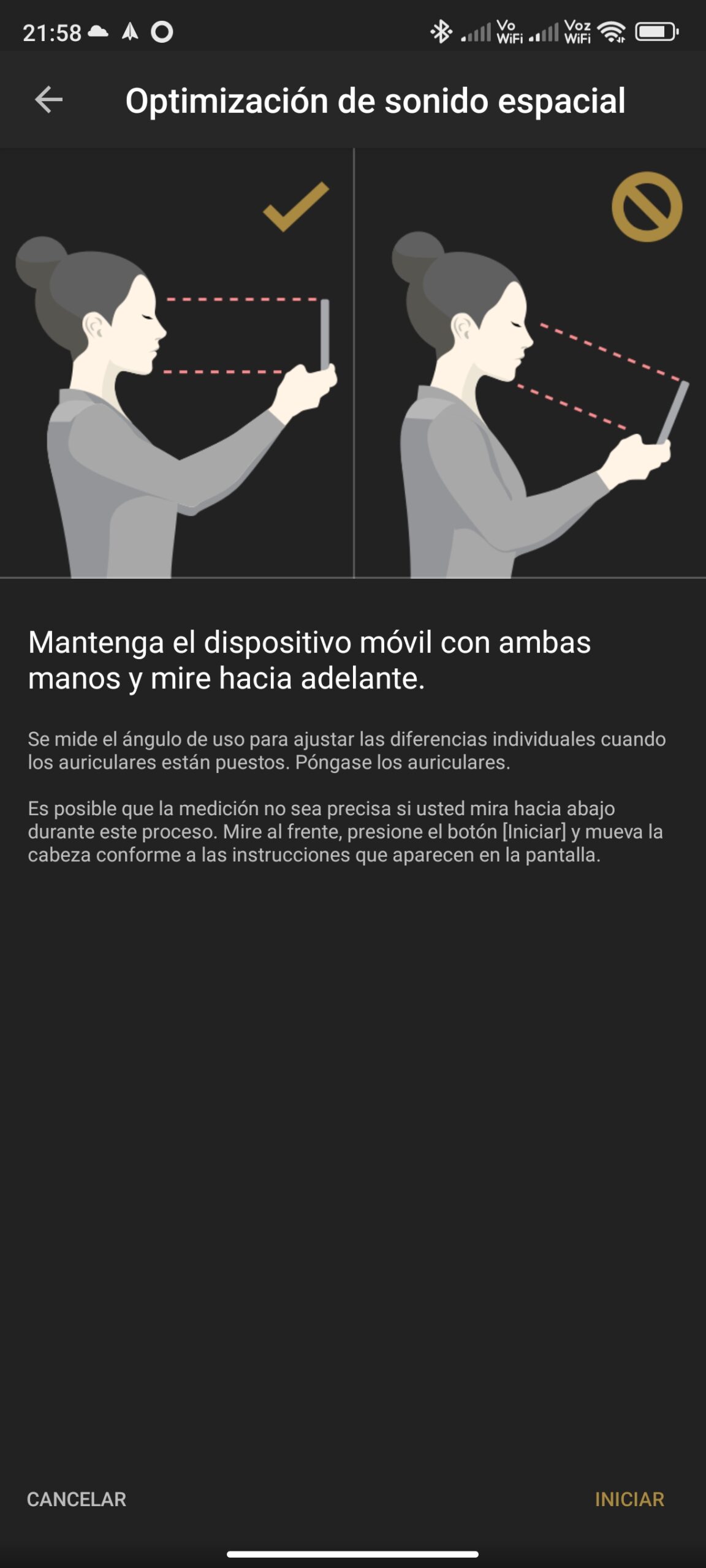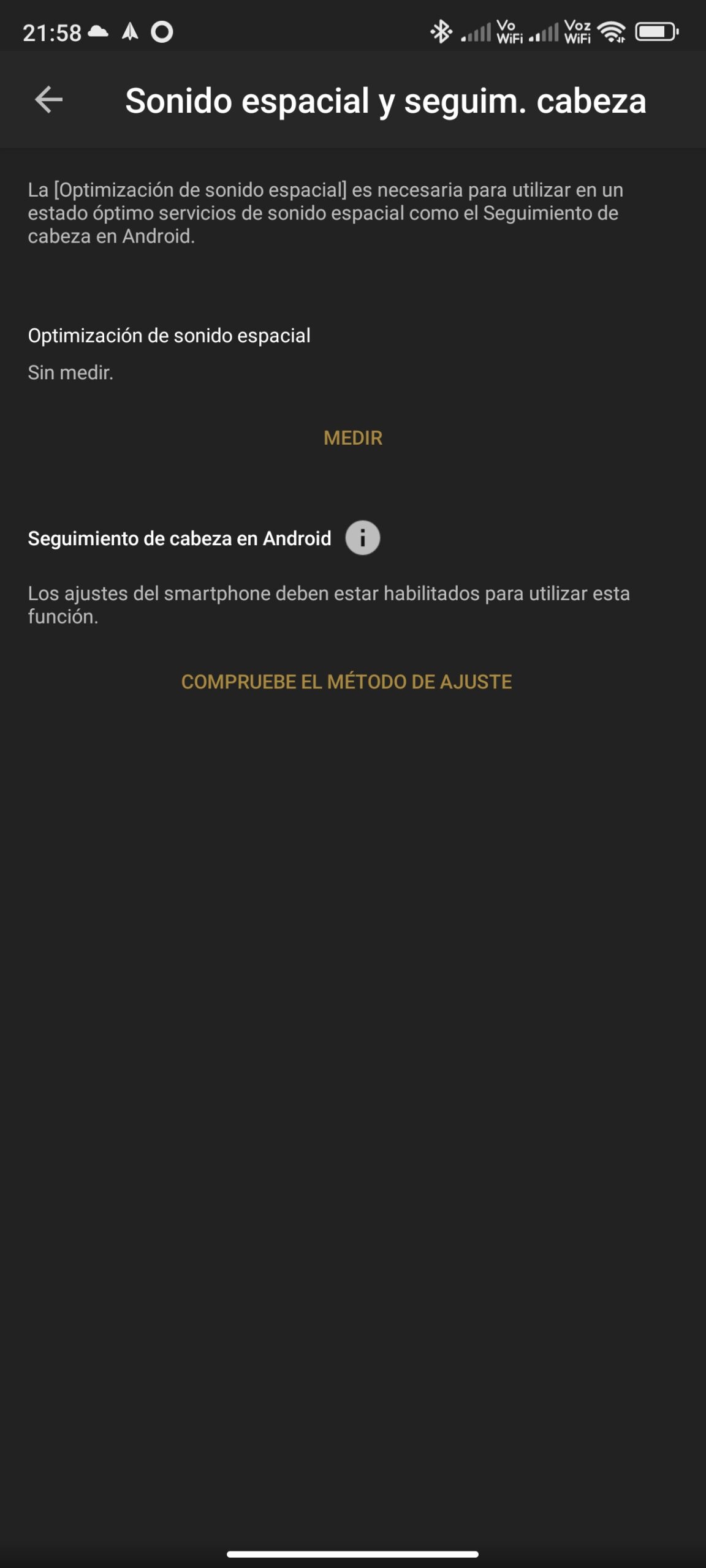 Finalmente tenemos la configuración del Sonido espacial, el cual funciona a través del movimiento de nuestra cabeza, por lo que, al realizar el ajuste inicial, la app te pedirá que muevas tu cabeza hacia la izquierda, derecha, abajo y arriba.