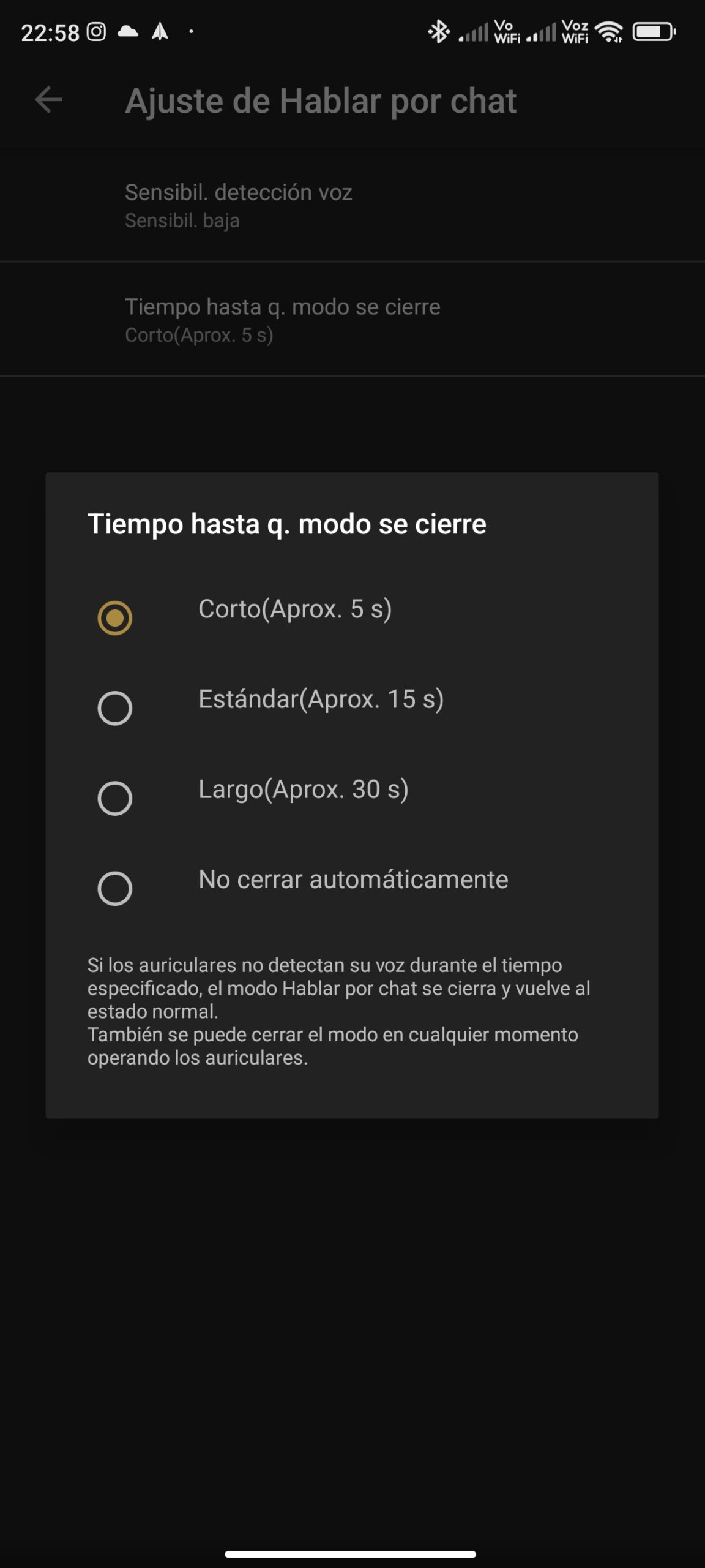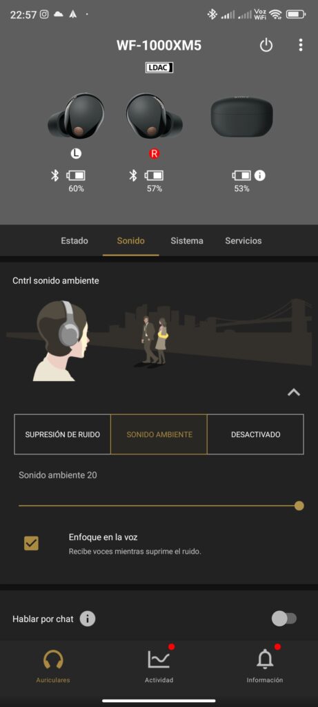 Luego tenemos el modo “Hablar por chat”, un modo bastante útil que detectará cuando comienzas una conversación con alguien y automáticamente detiene la música y activa el “Sonido ambiente” para que puedas conversar cómodamente. Una vez que los audífonos detectan que no estás hablando, reanudan la reproducción y activan la cancelación de ruido (si es que lo tenías activado antes de iniciar la conversación).