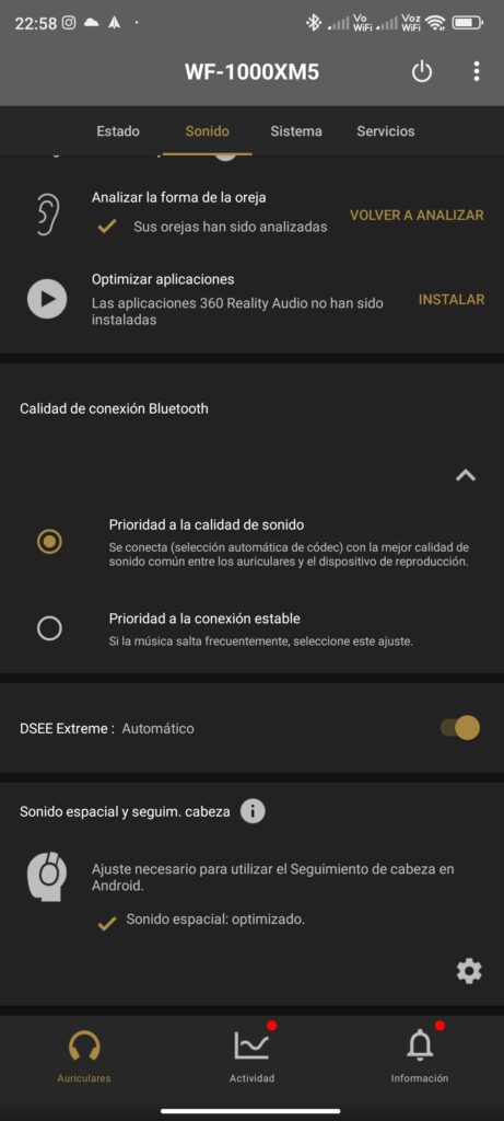 Seguimos con DSEE Extreme que, al activarlo, mejora la definición de la música, acercándolo un poco más hacia el audio de alta resolución sin pérdidas. Es una función que opera en tiempo real, por lo que el consumo de energía de los audífonos se eleva.