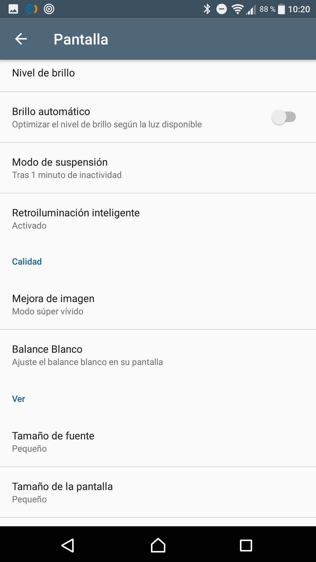 Entre las opciones de pantalla disponibles encontraremos opciones para ajustar el nivel de brillo, la función “Control inteligente de luz” que nos permitirá mantener la pantalla encendida mientras la estemos viendo, también podemos ajustar el balance de blancos, el tamaño de la letra e interfaz… entre otros ajustes.