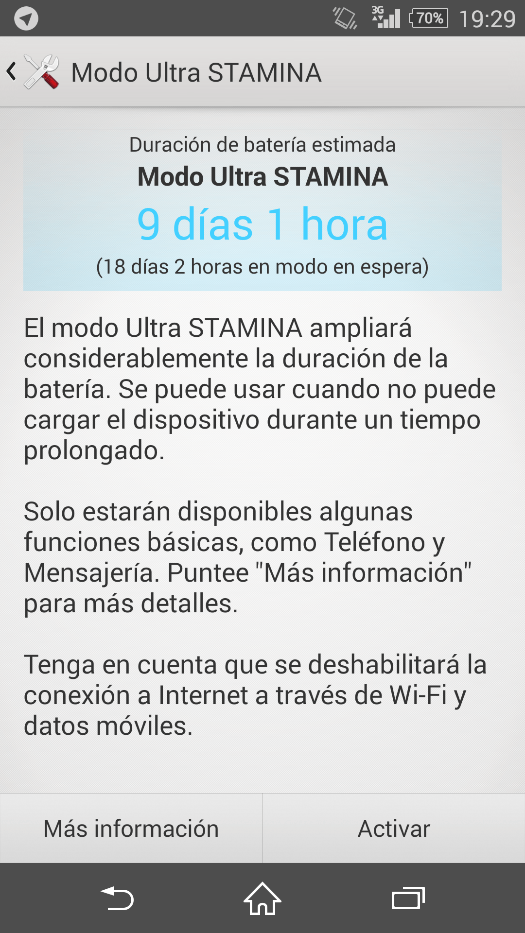 33 horas con 17 minutos y más de 4 horas de pantalla encendida. Brutal resultado comparando al resto de los gama alta actuales, pero esto no queda ahí. Sony ofrece la opción de ahorro de energía llamada Stamina, pero también encontramos un modo Ultra Stamina, con el cual podremos tener hasta 20 días de batería en nuestro celular, por muy increíble que parezca.
