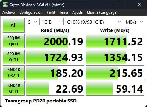 - SEQ1M Q8T1: 2000,19 MB/s lectura; 1711,52 MB/s escritura.