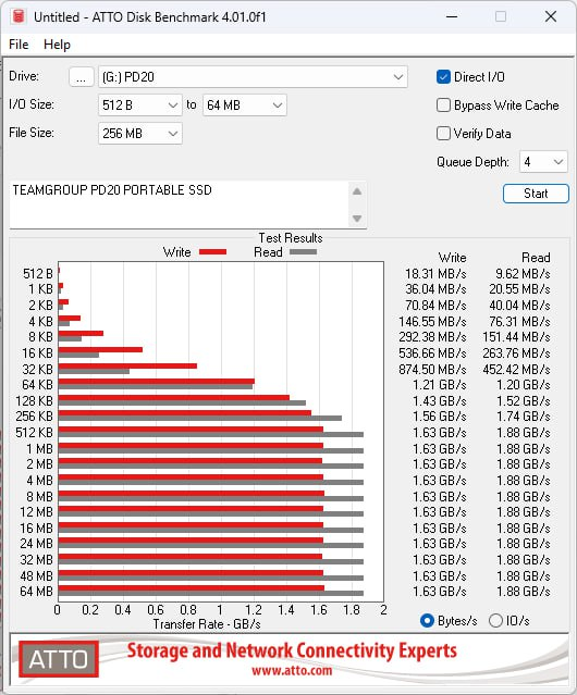 ATTO muestra que el PD20 logra su mejor rendimiento con bloques grandes: la velocidad aumenta con el tamaño de bloque y, a partir de cierto punto, se estabiliza. En esa zona estable, el rendimiento queda por debajo del máximo declarado (2000/1800 MB/s), especialmente en escritura.