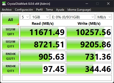 Durante la realización de las pruebas, Crystal Disk Mark 8.0.6 nos entregó los valores secuenciales más reales y ajustados a lo que indica en el fabricante en las velocidades teóricas. Acá la velocidad de lectura alcanzada fue de 11.671 MB/s, mientras que la de escritura alcanzó los 10.257 MB/s, situándose en la élite de las unidades PCIe 5.0 disponibles actualmente. En comparación, un SSD PCIe 4.0 de gama alta suele rondar los 7,000 MB/s, lo que significa que el salto de generación ofrece un incremento de rendimiento cercano al 60%.