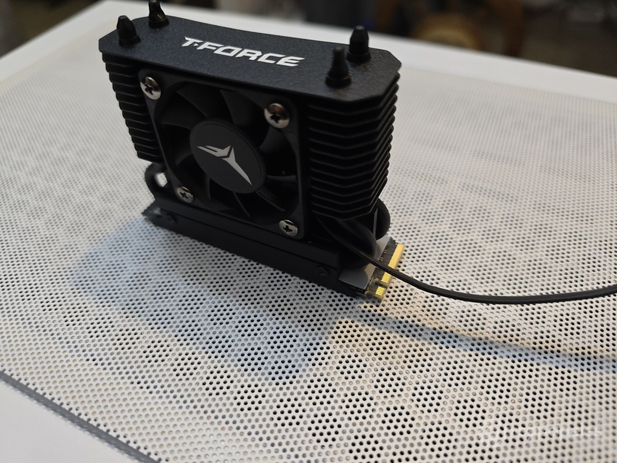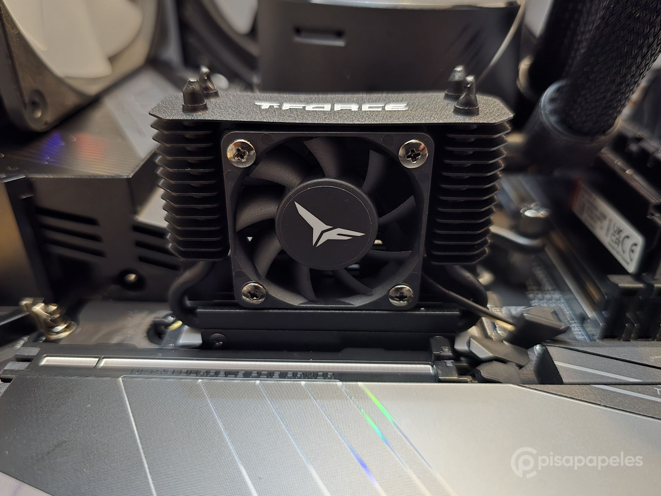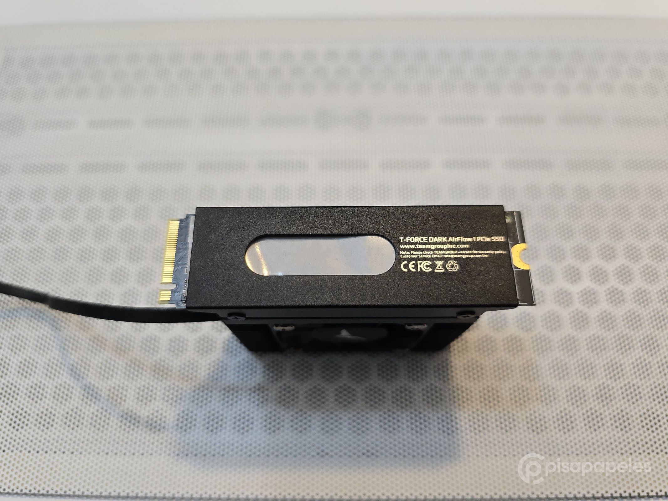 Por otra parte, TeamGroup también nos ha facilitado un producto que se complementa perfectamente con este SSD. Y se trata del T-Force Dark AirFlow I, un disipador térmico que combina refrigeración pasiva y activa en un mismo dispositivo. Esto permite mejorar la gestión de temperatura de los SSDs con PCIe 5.0, ya que sus altas velocidades, también vienen con una elevada liberación de calor.