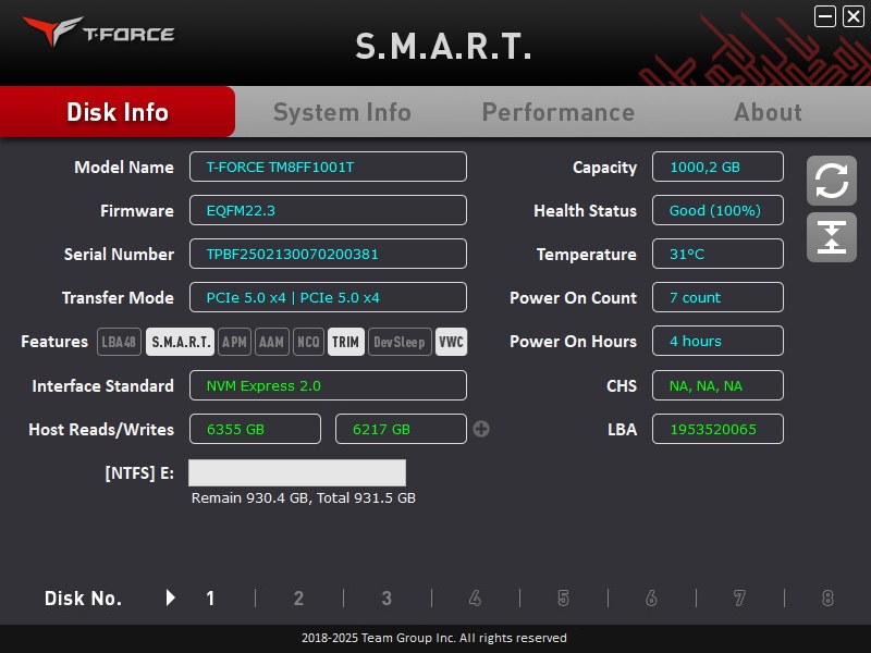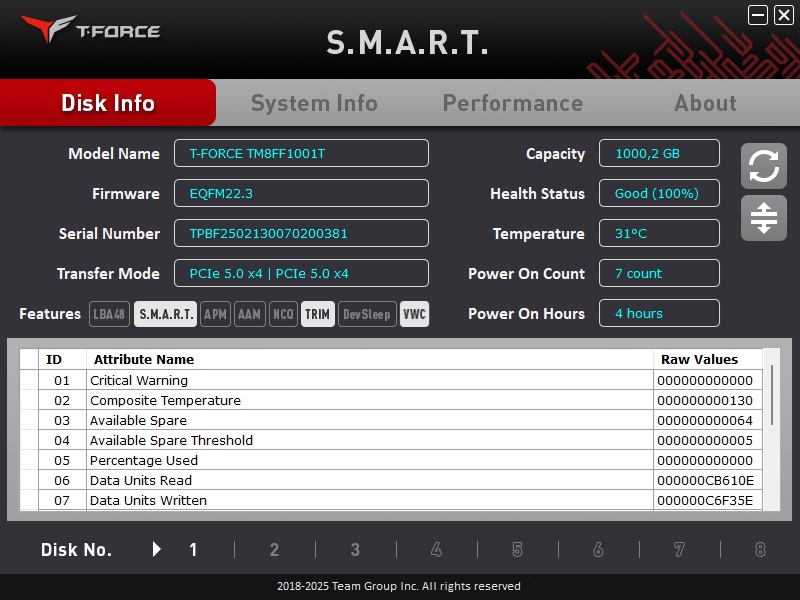 El T-Force Z540 es compatible con comandos TRIM, S.M.A.R.T. y utilidades estándar de monitoreo. TeamGroup tiene un software para gestionar y monitorear a este SSD. Este permite revisar parámetros importantes como la salud, temperatura, horas de encendido, capacidad disponible, número de serie, el modo de transferencia que está siendo usado con la unidad y más.