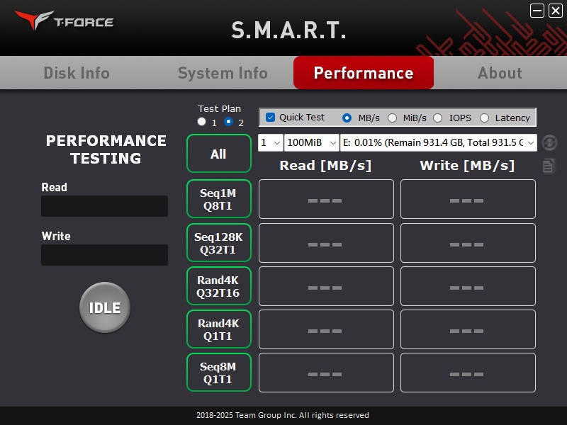 Sobre el software, este se llama SMART Tool y la versión que probamos es la 0.1.6.4. Así mismo, la aplicación es compatible con Windows 10 y Windows 11. La app también incluye una pestaña para realizar pruebas de velocidad del SSD, la cual es muy parecida a CrystalDiskMark.