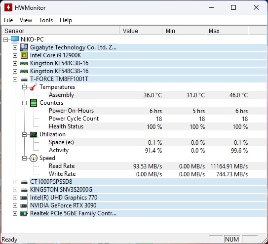Mientras que sacando el máximo rendimiento con el disipador que trae de serie la placa madre, el SSD alcanzó una temperatura estable de 36°C con un máximo de 46°C.