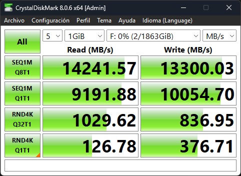 Pasando a los resultados, al momento de realizar las pruebas técnicas exhaustivas con Crystal Disk Mark 8.0.6, esta aplicación nos entregó los valores secuenciales más cercanos y realistas a lo que indica el fabricante en las velocidades teóricas especificadas. Acá la velocidad de lectura alcanzada fue de 14.241 MB/s, mientras que la velocidad de escritura alcanzó los 13.300 MB/s, resultados muy cercanos y coherentes con las especificaciones del fabricante.