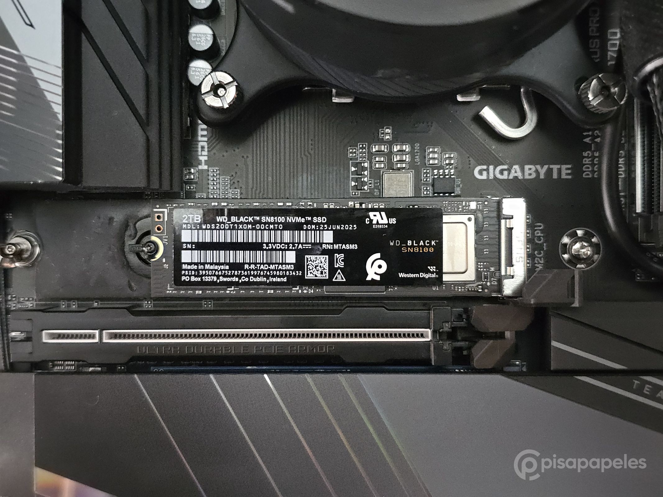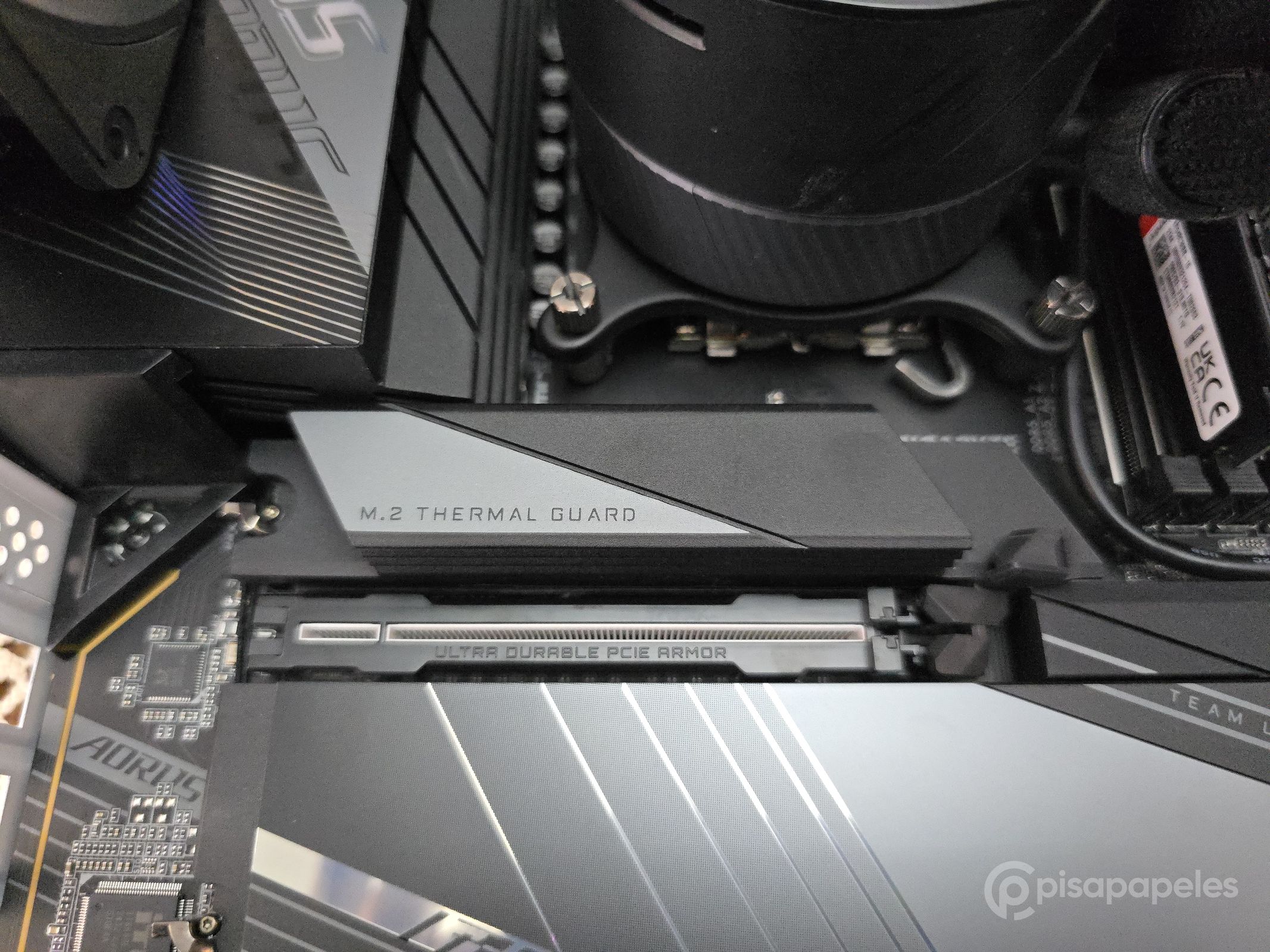 En nuestro caso específico, la placa madre Z790 AORUS PRO X WIFI 7 también cuenta con un bloque disipador integrado en la ranura M.2 más grande de lo habitual, proporcionando disipación térmica que también depende de la placa madre que estamos usando. De todos modos, el SSD funciona bien incluso en equipos ultradelgados como las laptops compactas o consolas portátiles.