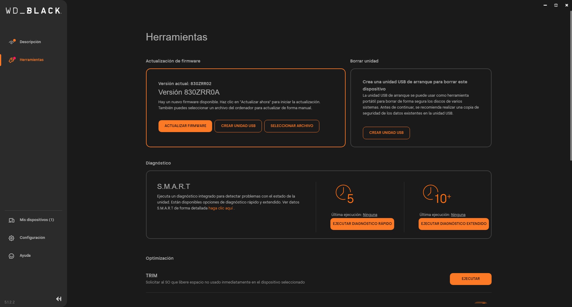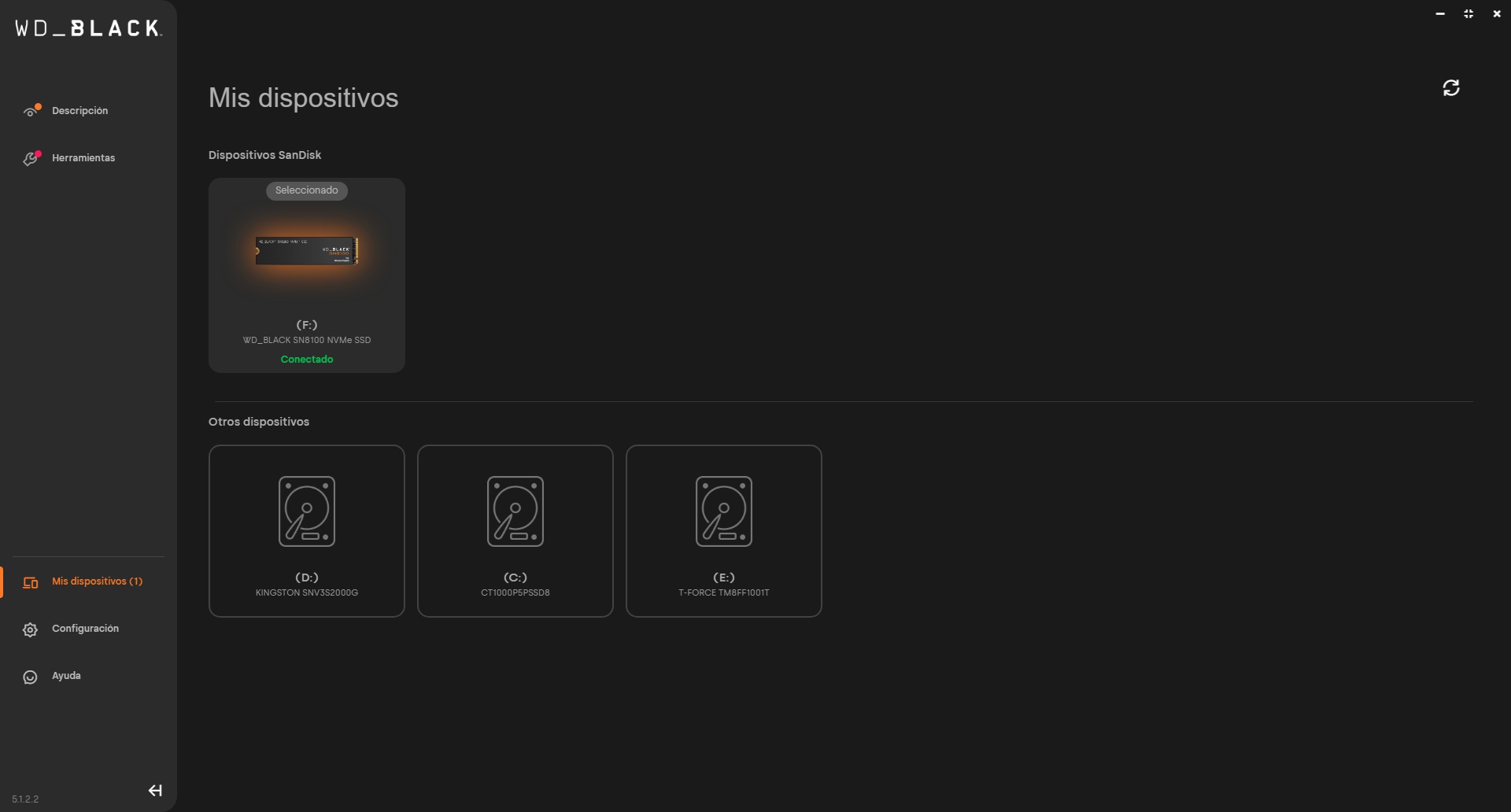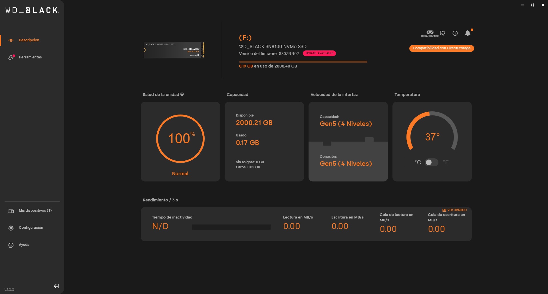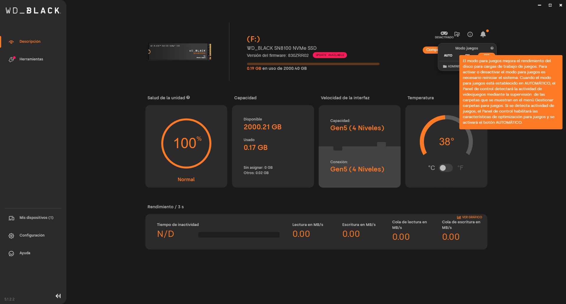 Para el caso de las unidades SSD más recientes como el WD_Black SN8100 de gama premium, la aplicación muestra el uso de tecnologías adicionales como el Modo Juego o la compatiblidad con DirectStorage. El modo juego permite mejorar el rendimiento del SSD, el cual detectará la actividad de videojuego para optimizar la respuesta durante la carga y su funcionamiento. El software es completamente compatible con Windows 10 y Windows 11 en versiones de 64 bits. No es compatible con MacOS ni Linux. Durante nuestro análisis utilizamos la versión más reciente del software disponible en el sitio oficial que corresponde a la 5.1.2.2.