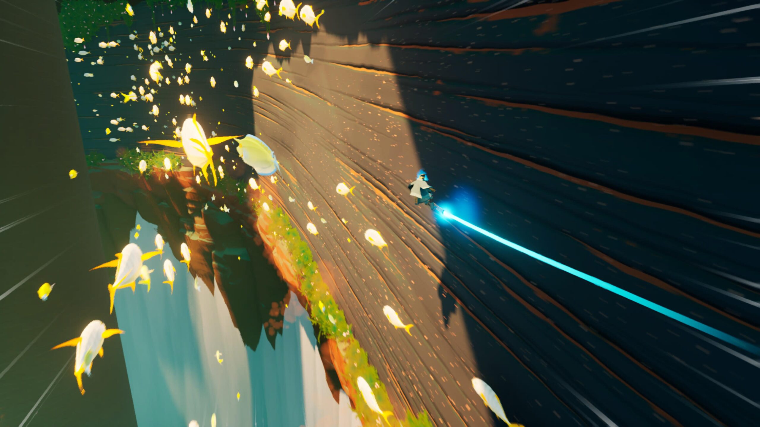 Visualmente, Sword of the Sea es para deleitarse constantemente. Su dirección artística utiliza paletas de colores que se contrastan de manera excelente en todo momento. Los escenarios están en movimiento y se transforman continuamente.