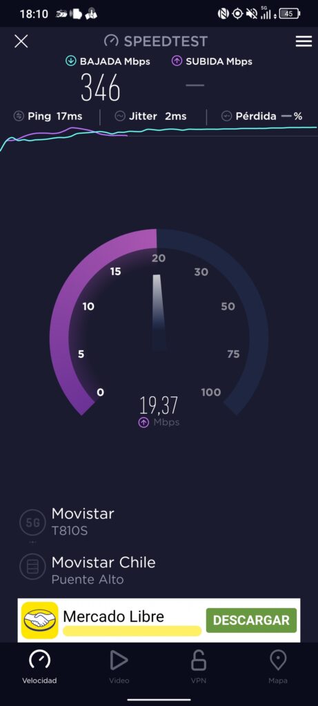 Tal y como lo indica su nombre, este smartphone es compatible con las redes 5G nacionales. De hecho, pude conectarme sin problemas a la red 5G de Movistar y Entel, y en esta captura puedes ver cómo operaba con la red 5G de Movistar en el centro de Pichidegua, Región de O’Higgins.
