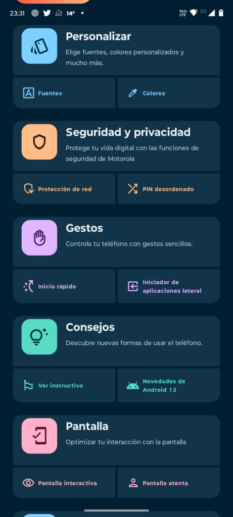 El equipo viene de fábrica con el sistema operativo Android 13 y como ya es costumbre en los smartphones de Motorola, la interfaz se mantiene casi sin modificar, por lo que tendrás una experiencia muy similar a lo ofrecido por Google con sus Pixel.
