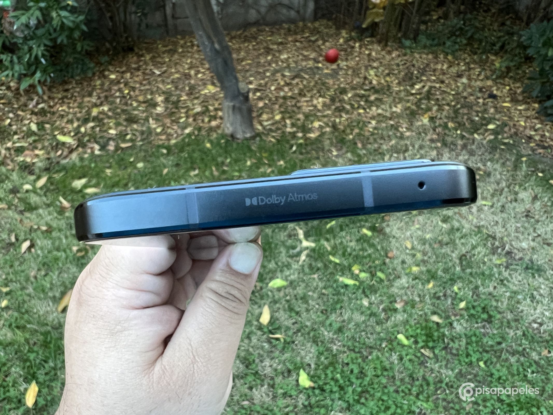 Por el lado superior tenemos un segundo micrófono acompañado del logo “Dolby Atmos”. En el lado inferior tenemos uno de sus altavoces, seguido de su micrófono, puerto USB Tipo-C, y la ranura para una única tarjeta Nano SIM.