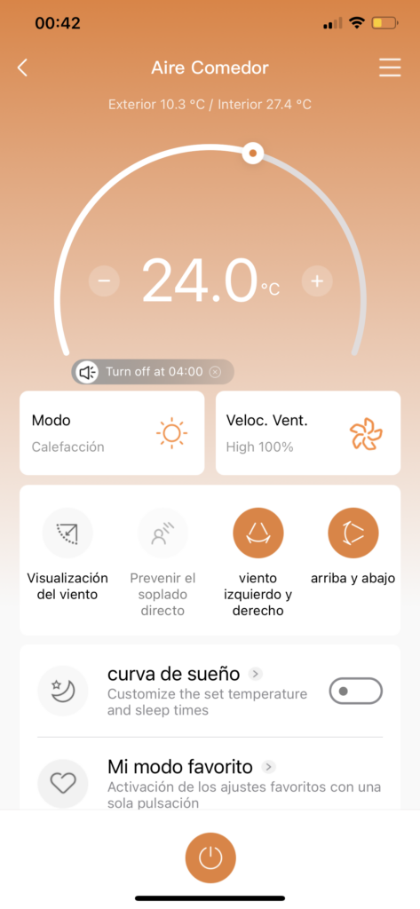 Ya conectados al equipo, primero encenderlo y apagarlo, pero también cambiar de modo, y velocidad, así como también de temperatura en la parte principal de la pantalla. Más abajo, encontramos una caja con las principales funciones. Mientras que al final una serie de opciones que van a cambiar según el modo que tengamos activo, como es el caso del turbo para el ventilador, el modo eco o la autolimpieza.