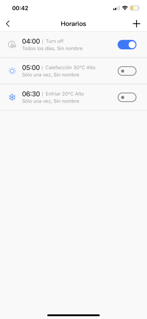 Siguiendo los pasos de la función temporizador, nos encontramos con la opción de “horarios”. Esta básicamente nos permite fijar rutinas de encendido, apagado o cambio de temperatura. Según lo fijemos, el equipo se prenderá o apagará con una temperatura determinada según la hora. Estas rutinas se pueden fijar por una única vez, ciertos días o siempre. En mi caso tengo determinado a qué hora debe apagarse todos los días.