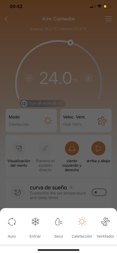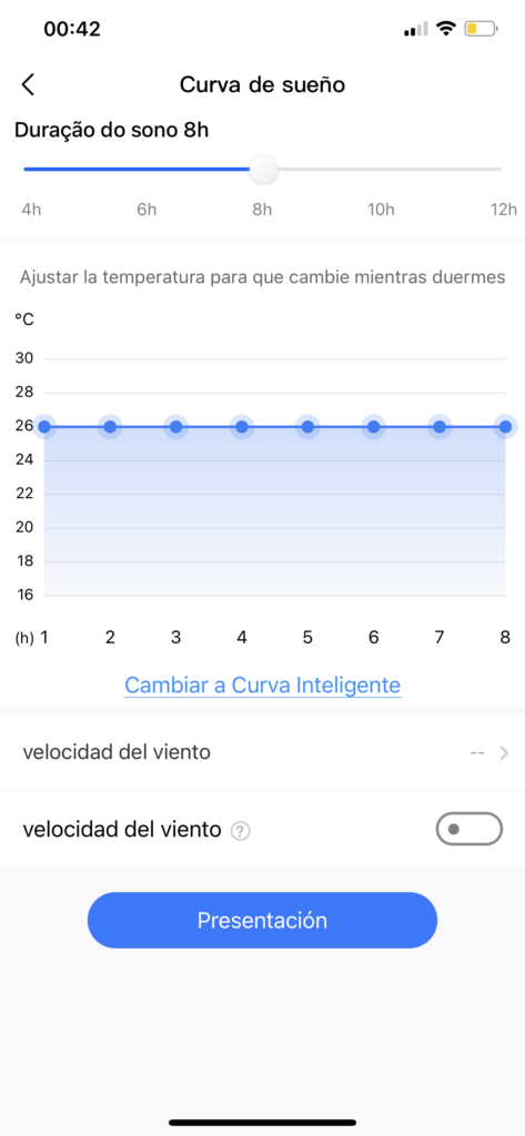 Pero también contamos con algunas acciones diferentes a las que podemos realizar con el control. Si bien son iguales a las del control, estas van a operar de mucho mejor manera en la app. Por ejemplo, la “curva de sueño” opera bajo la función sleep, pero desde el teléfono podremos fijar por hora la temperatura que queremos que opere el equipo según el tiempo. Así como activar esto mismo, pero de manera inteligente y automática.