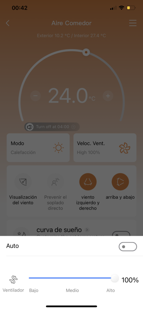 La más baja, en la cual el ventilador se mueve a una velocidad entre 1 y 20% es la de silencio, donde simplemente no escucharemos nada del funcionamiento del equipo, aunque obviamente el aire que tira es muy poco. Lo sigue bajo, medio y alto, pasando de un 21% hasta el 100%, la máxima velocidad. Pero además de eso, tenemos la función turbo como te dije, con la cual se tira aún más aire. Eso sí, ahí sí mete un poco más de ruido el aire acondicionado, aunque nada molesto.