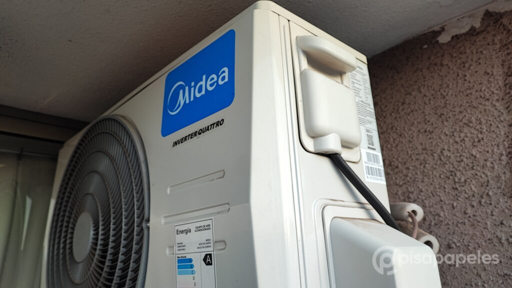 En el caso del condensador, o equipo exterior, estamos ante un Midea modelo MOX130, el cual tiene unas dimensiones de 72 cm de ancho, 27 cm de alto y 49,5 cm de largo, y un peso de 25,6 kg.