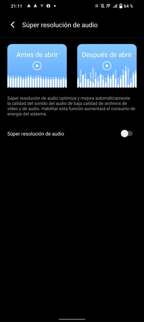 También tenemos una opción llamada “Súper resolución de audio” que optimiza y mejora la calidad de sonido del audio de baja calidad de manera automática, obviamente activar esto aumenta el consumo de energía.