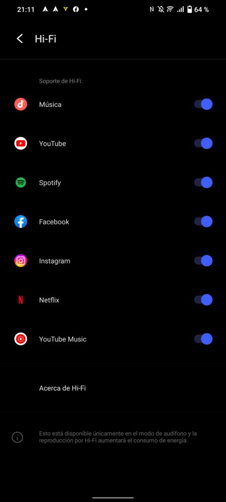 Lo que sí tenemos es el soporte de audio Hi-Res o Hi-Fi, ya que cuenta con el soporte de audio 32-bit/192kHz. De hecho, en el menú de sonido tenemos una opción llamada “Hi-Fi” la cual podemos activar en cada aplicación que queramos, aunque el sistema advierte que solo funcionará en modo audífono y que aumentará el consumo de energía.
