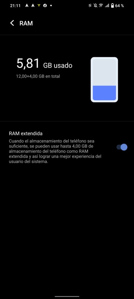 De hecho, contamos con 12 GB de RAM que es una memoria física, pero la capa de personalización nos permite utilizar 4 GB del almacenamiento interno como memoria RAM extra y así viene configurado de fábrica, por lo que, en teoría, el equipo tiene hasta 16 GB de RAM, lo que mejora aún más el rendimiento del sistema.
