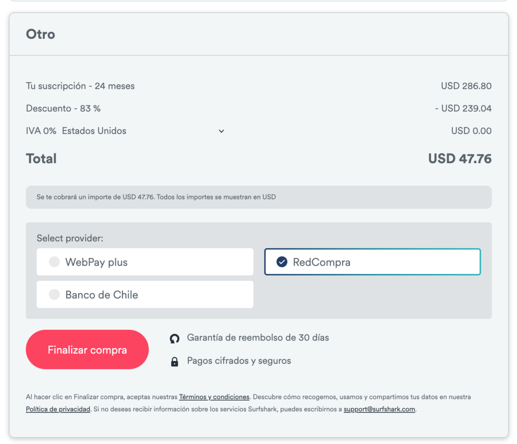 Surfshark ofrece tres modalidades de planes: Pagando mes a mes, pagando un año de corrido o pagando dos años de corrido.