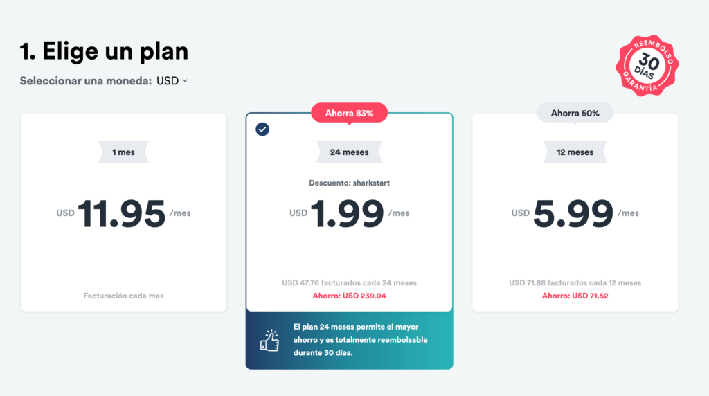 Pagando mes a mes, el costo mensual es de USD $11,95. Pagando un año completo, el costo mensual es de USD $5,99, lo que se traduce en un solo pago anual de USD $71,88. Por último, el pago de dos años tiene un costo mensual de USD $1,99, lo cual se convierte en un solo pago de USD $47,76. Las tres opciones son reembolsables por 30 días. Incluso te permite pagar con RedCompra o WebPay.