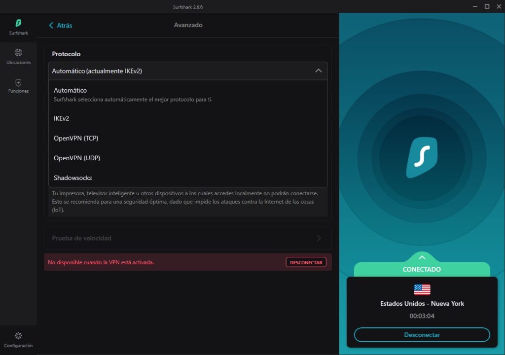 Surfshark ofrece múltiples métodos de conexión: IKEv2, OpenVPN (TCP), OpenVPN (UDP) y Shadowsocks. Cada uno tiene sus ventajas, desventajas y temas técnicos de seguridad. Una de las ventajas de OpenVPN es que no es susceptible a bloqueos por firewall ya que permite utilizar cualquier puerto en TCP o UDP. IKEv2, por otro lado, es súper rápido, pero las plataformas compatibles son más limitadas y es susceptible a bloqueos en firewalls. Por último, Shadowsocks está pensado para saltarse bloqueos de entidades gubernamentales como, por ejemplo el Gran Firewall de China. Sin embargo su disponibilidad en plataformas es muy reducida.